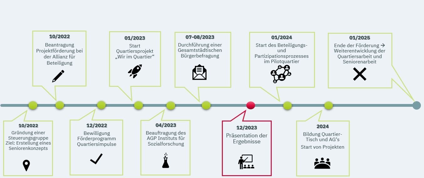 Der gesamte Prozess wird von einer Steuerungsgruppe begleitet, die für Beratung und Betreuung des Projekts zuständig ist. Diese besteht aus dezernatsübergreifenden Mitarbeitenden der Stadtverwaltung, Multiplikator/-innen aus der Zivilgesellschaft wie dem Stadtseniorenrat, der Beraterin Frau Claudia Peschen und weiteren themenbezogenen Projektpartnern. Diese überwacht den Gesamtprozess, behält die Ziele im Blick und steuert bei unerwünschten Entwicklungen gegebenenfalls gegen.