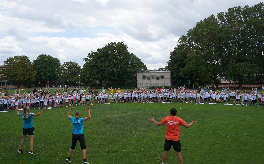 Mit einer Rekordzahl von 432 Vorschülerinnen und Vorschüler sowie ca. 90 Betreuerinnen und Betreuer begann das Kindergartensportfest mit der offiziellen Eröffnungsfeier, bei der alle Kinder in ihren selbstgestalteten T-Shirts und ihrer Kindergartenfahne unter der Musik von Fluch der Karibik auf den Sportplatz im Sportpark Ost einliefen. Nach einer kurzen Eröffnungsrede, tanzten alle gemeinsam "Theo Theo" und dann ging es für die Vorschülerinnen und Vorschüler direkt los. Es galt elf sportliche Stationen zu bewältigen und ein spannendes Quiz gemeinschaftlich zu lösen, zusätzlich wartete in der Sporthalle Ost ein großer Bewegungsparcours auf die Kinder.