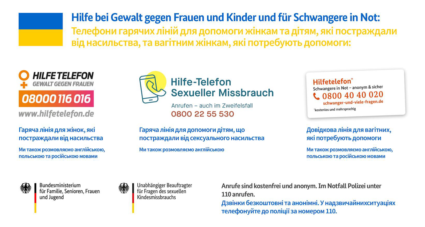Diese ist mit russisch und ukrainisch sprechenden Mitarbeiterinnen und Mitarbeitern besetzt und unter der Nummer: 0800 70 22 500 erreichbar. Hier finden Sie weitere Informationen. - Die ARD hat in ihrer Mediathek Inhalte zum Erlernen der deutschen Sprache für geflüchtete Kinder aus der Ukraine eingerichtet, welche Sie hier finden.